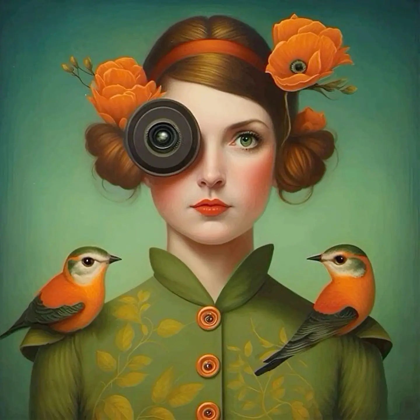 Floral Girl Poster | Optic Garden Artwork | Whimsical Woman with Bird and Botanical Embellishments | Nature Inspired Wall Decor