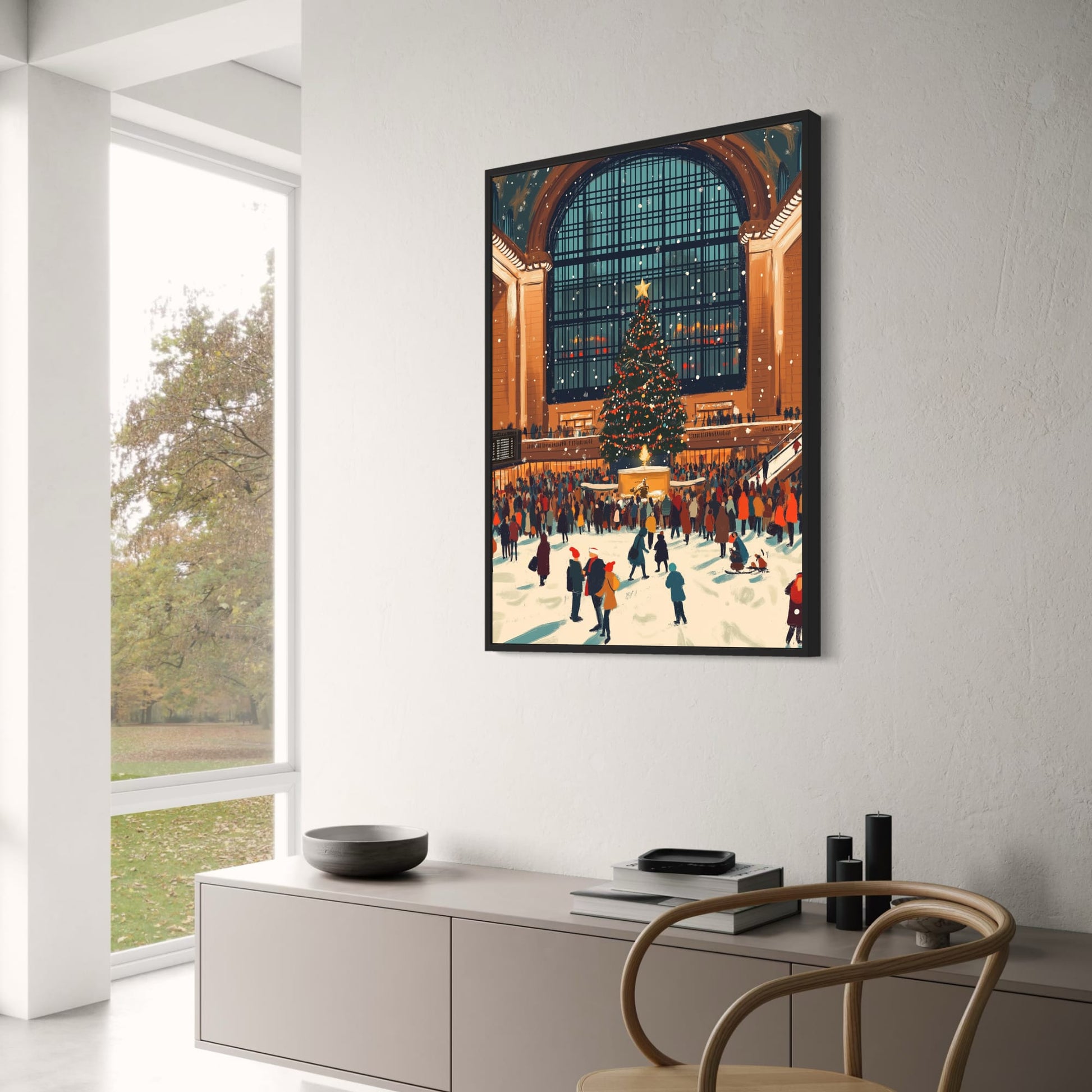 Grand City Station | Christmas Poster Print | Festive Holiday Scene | Majestic Tree | Snowy Urban Landmark | Winter Decor