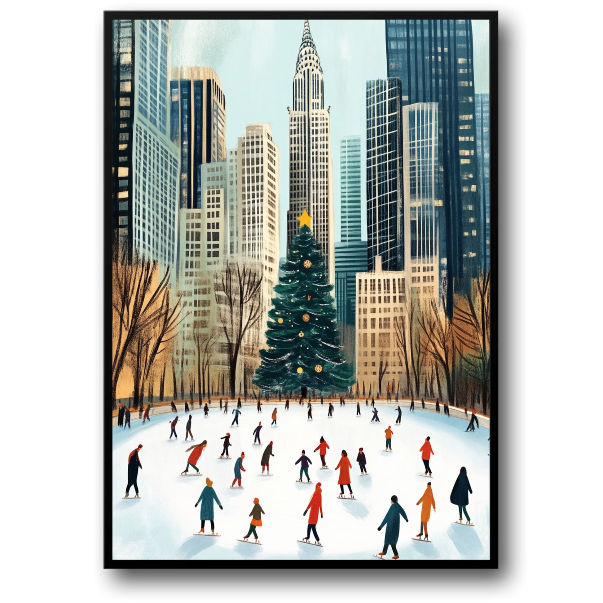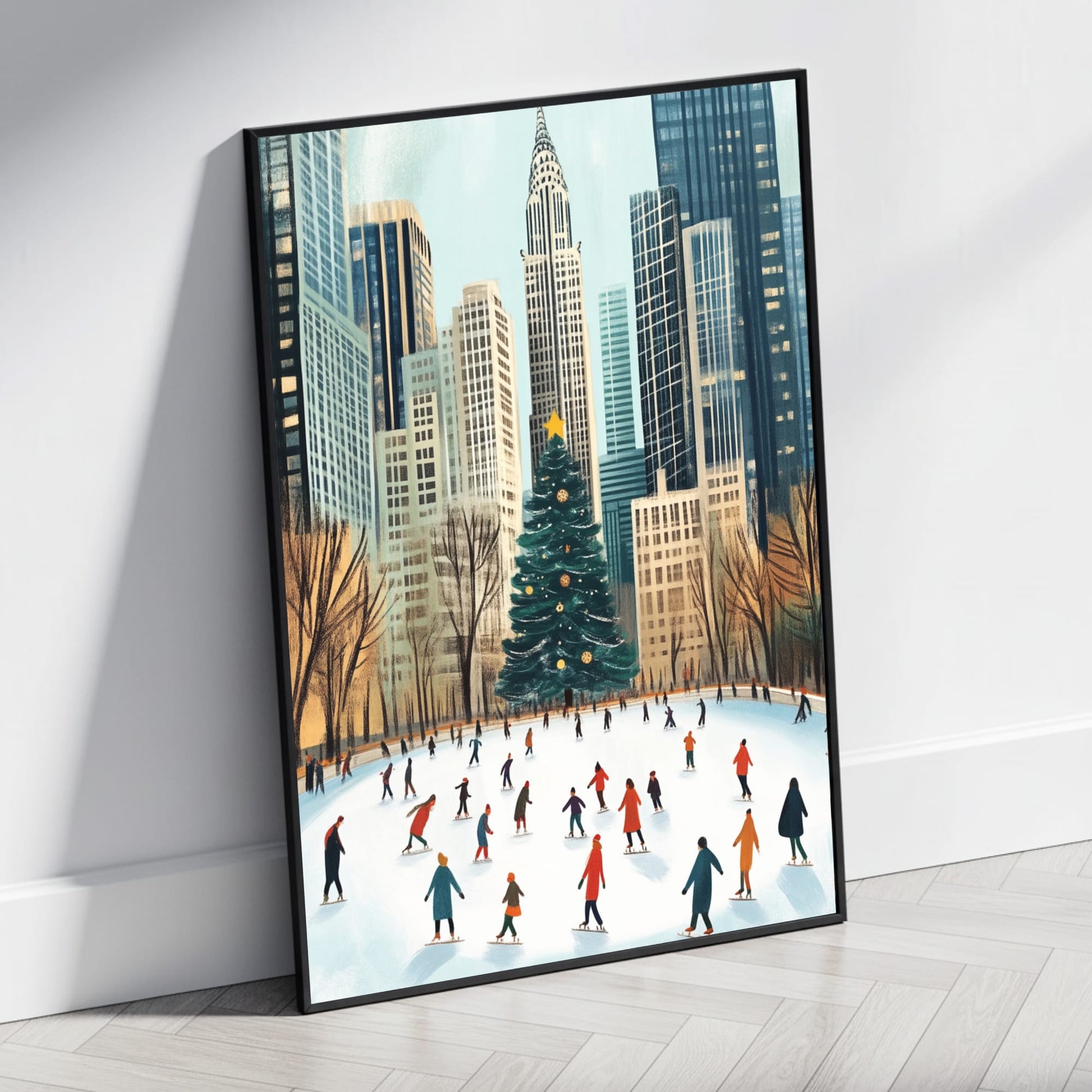 Winter Wonderland Cityscape | Ice Skating Scene | Vibrant Holiday Decor | Christmas Tree | Urban Outdoor Rink Print | Festive Poster